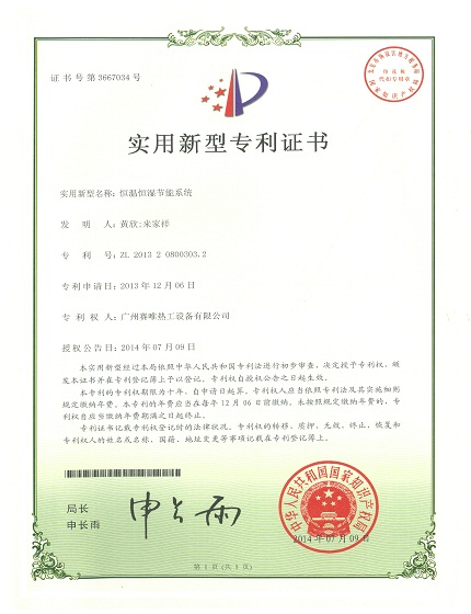 恒温恒湿节能系统(专利证书)2014年07月