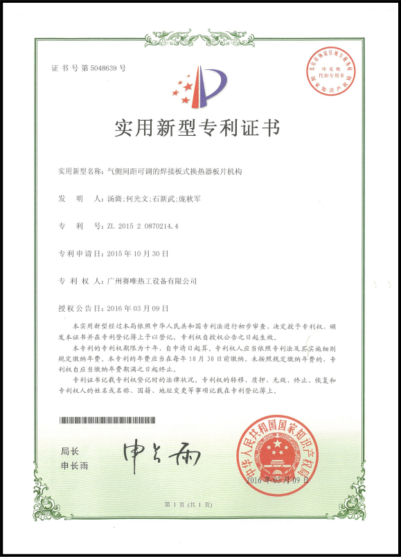 气侧间距可调的焊接板式换热器板片机构(专利证书)2016年03月