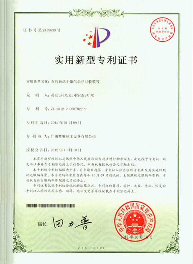 石膏板烘干烟气余热回收装置(专利证书)2012年10月