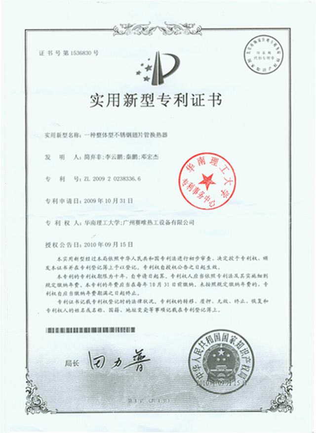 一种整体型不锈钢翅片管换热器(专利证书)2010年09月