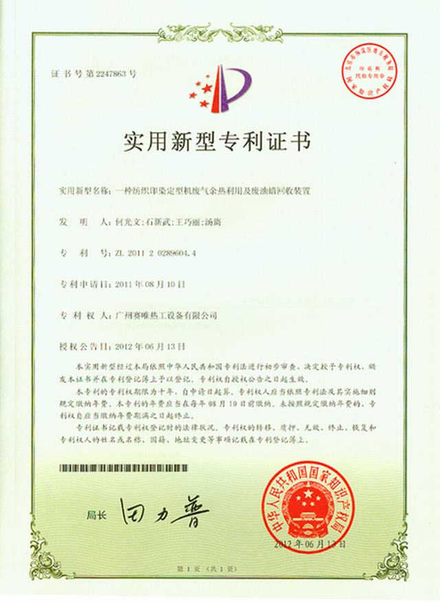 一种纺织印染定型机废气余热利用及废油蜡回收装置(专利证书)2012年06月