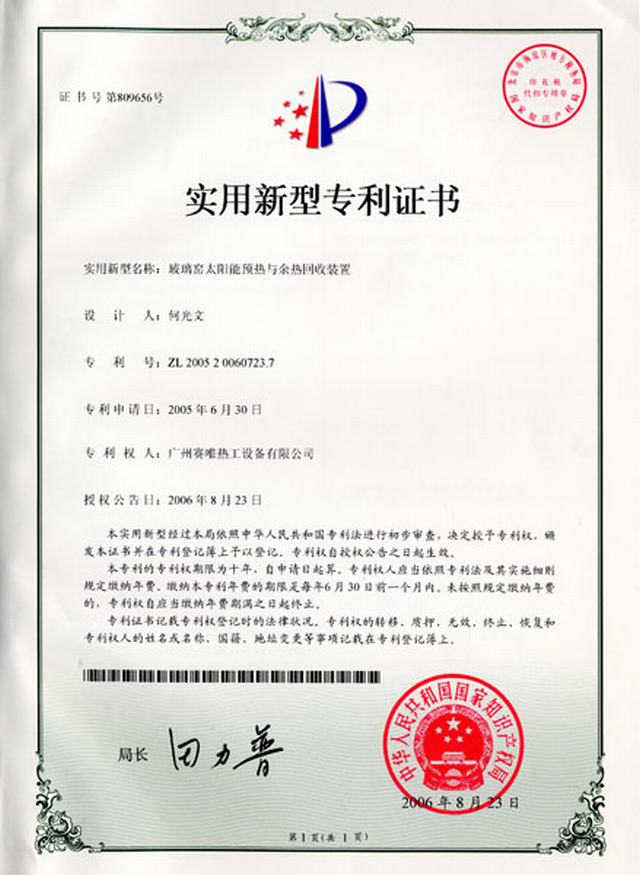 玻璃窑太阳能预热与余热回收装置(专利证书)2006年08月