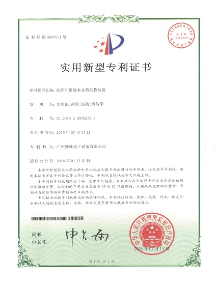 纺织印染废水余热回收装置(专利证书)2016年01月