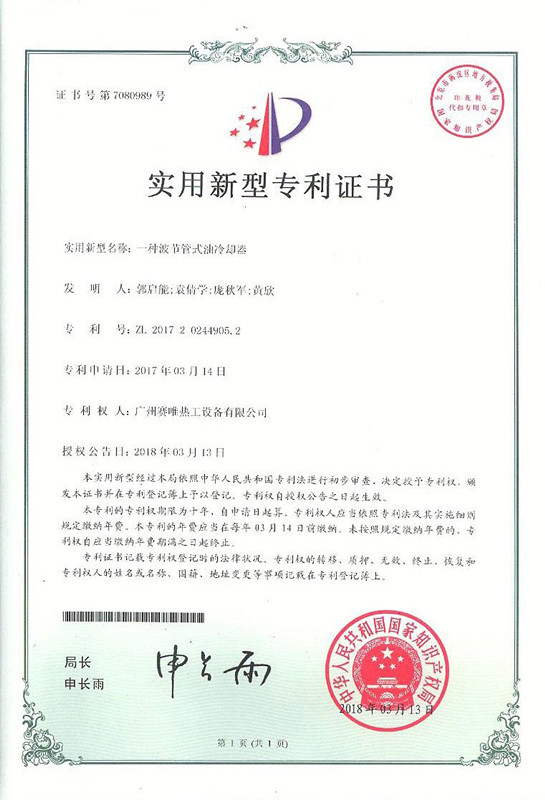 一种波节管式油冷却器(专利证书)2018年03月